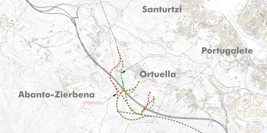 En ambos casos, el trazado se desarrolla soterrado en toda su longitud y se incluye el tramo con el que se prevé la futura compatibilidad con el corredor Bilbao-Santander. La alternativa B, por la que se más se inclina el estudio, se separa de la cantera en la medida de lo posible, así como del área de influencia de sus excavaciones.