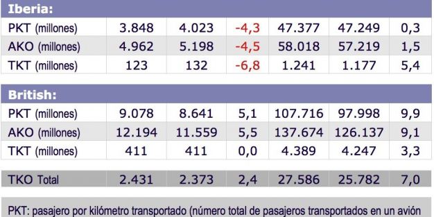 Frente a estas cifras en rojo de Iberia, British presenta unos datos mejores con crecimiento en el mes de noviembre, si bien la tendencia en todos los indicadores, tanto en oferta como en demanda, es de disminución continuada. Así en el acumulado de los últimos seis meses la demanda cae un 5%, la capacidad ofertada un 4% al igual que la carga transportada, que en noviembre se estanca en 411 millones de toneladas/kilómetro transportadas.