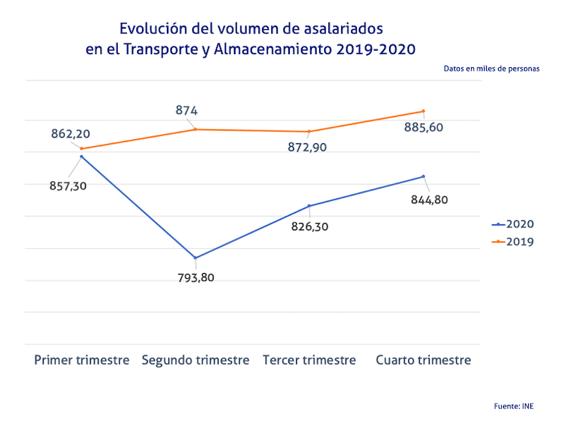 Así mismo, durante el cuarto trimestre de 2020, el INE ha registrado 844.800 asalariados en el sector de transporte y almacenamiento, un 4,61% menos que hace un año y un 2,24% más que en el tercer trimestre de 2020.