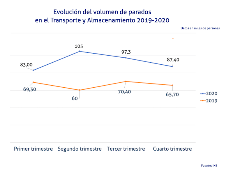 Por otro lado, durante el último trimestre de 2020, el sector del transporte y almacenamiento contaba con un total de 87.400 parados, un 33,03% más que en el mismo trimestre de 2019, pero un 10,17% menos que en el tercer cuarto de 2020.