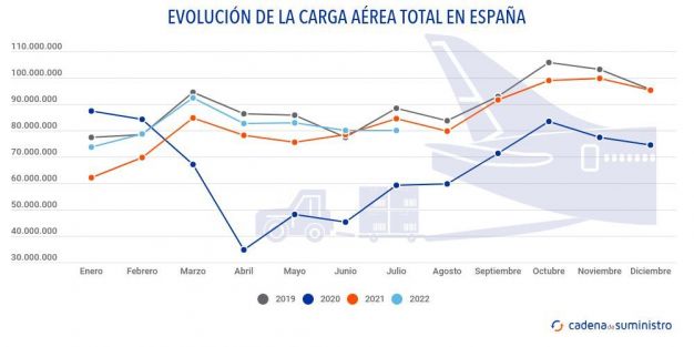 De igual manera, en los siete primeros meses de 2022, el tráfico total del sistema aeroportuario español suma, por lo que respecta a la carga aérea, un total de 573.481.479 kg de mercancías, un 7,5% anual más, aunque un 2,5% por debajo de los volúmenes del mismo período de 2019.