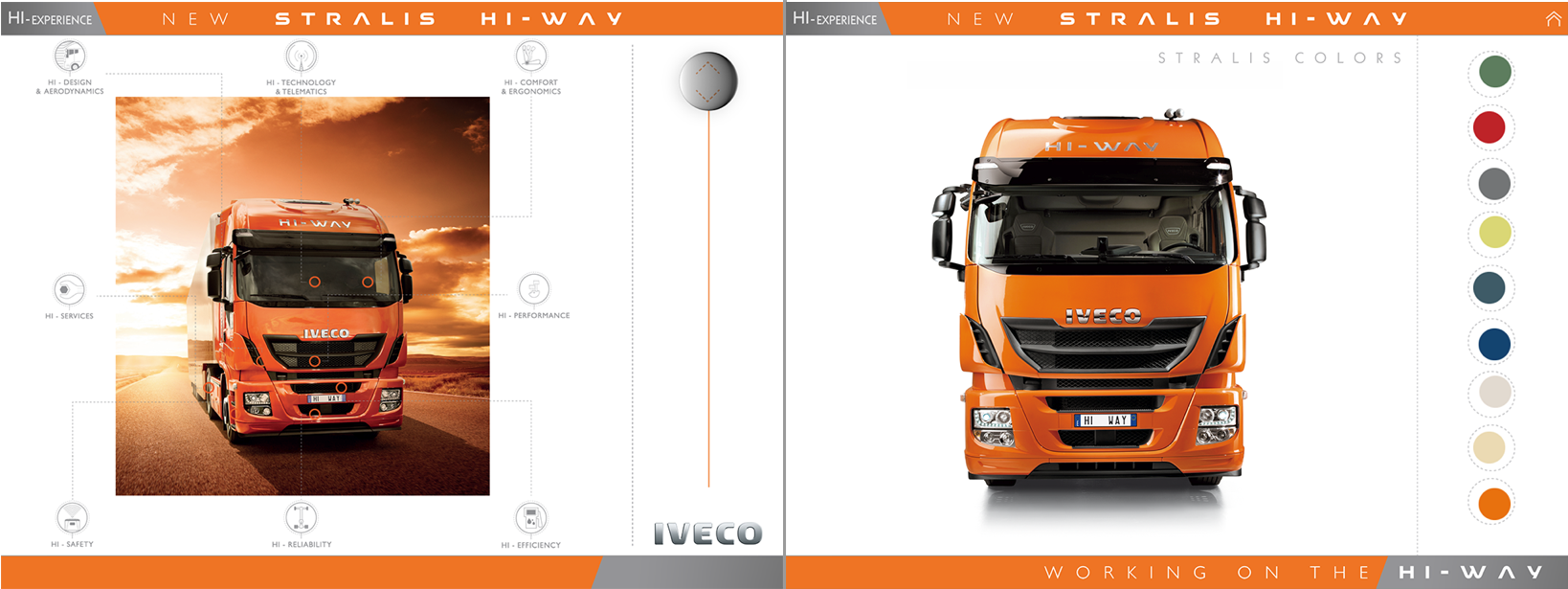 Las nuevas aplicaciones de Iveco van guiando al usuario, gracias a un menú interactivo, a través de informaciones como, por ejemplo, el estilo de los vehículos, su confort de marcha, el alto rendimiento de sus motores o el bajo impacto medioambiental.