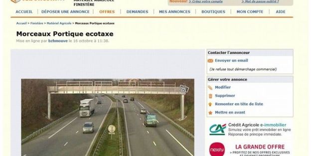 El anunció se presentó con una imagen de la estructura y se fijó el precio en 2.000 euros. “Piezas de un pórtico de la ecotasa desmantelado esta semana”, se leía. "Material de aluminio inoxidable a recoger en la zona de descanso Pont-de-Buis, trabajo de carga incluido", bromeó el vendedor con el seudónimo de "bzhmouve".