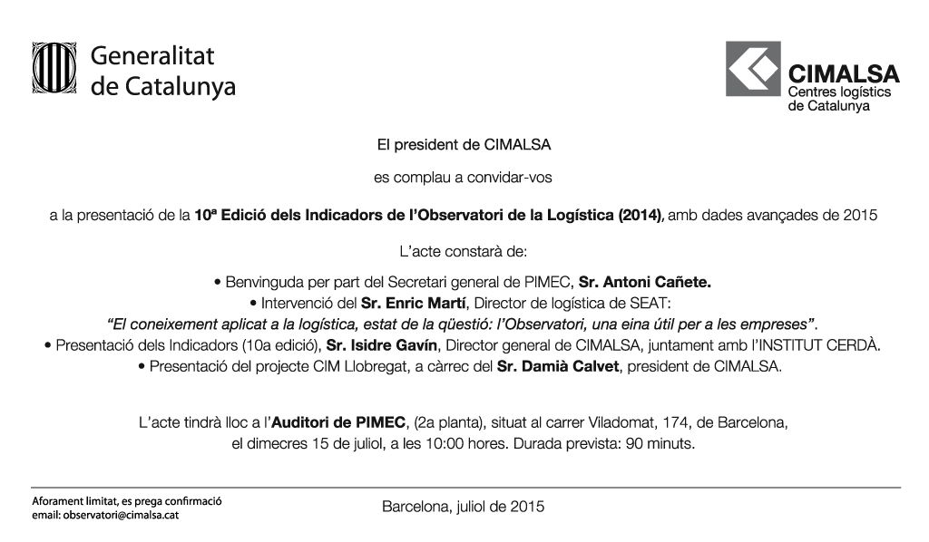 Cimalsa, empresa pública de la Generalitat de Cataluña, presentará el miércoles 15 de julio los indicadores 2014 del Observatorio de la Logística.