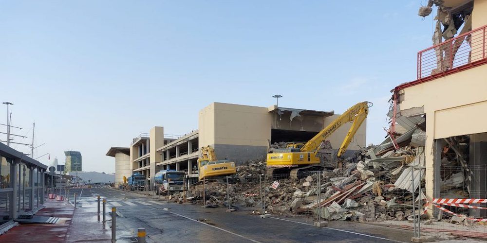 Tras los primeros trabajos de demolición, los antiguos edificios de las Estaciones Marítimas del muelle Santa Catalina del puerto de Las Palmas.