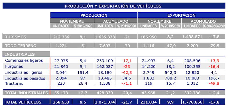 Respecto a los industriales pesados, en noviembre se han exportado un 788,2% anual más, con 1.883 unidades, y en cuanto a las tractoras, en el mes se han exportado 119, un 16,7% más que en idéntico mes de 2019.