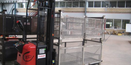 El AGV está basado en un apilador convencional, al que se le añadieron unas uñas especialmente largas para poder coger los cestones de dos metros de longitud.