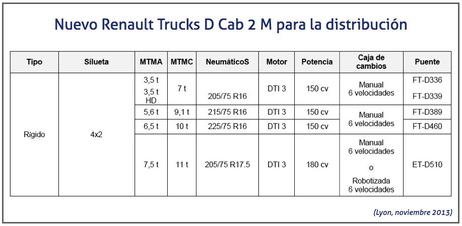 Renault Trucks ofrece tres modelos en la gama D: el Renault Trucks D (de 10 a 18 t), el Renault Trucks D Wide (de 16 a 26 t) y el Renault Trucks D Access (de 18 a 26 t). ). Un complemento de esta oferta está también disponible para cubrir las necesidades de los clientes de 3,5 a 7,5 t: el Renault Trucks D Cab 2m, ideal para la distribución urbana de medio tonelaje.