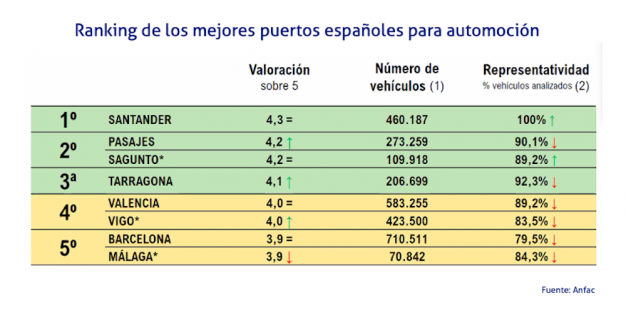Más en detalle, Santander se coloca como el enclave con mejor valoración gracias a una puntuación de 4,3 puntos, la misma que en 2018. Tras el recinto cántabro se coloca el puerto de Pasajes, que incrementa su calidad logística para automoción en 2019 y alcanza una valoración de 4,2 puntos, exactamente la misma que el recinto portuario de Sagunto, que mantiene la misma puntuación que un año antes, cerrando el podio portuario.