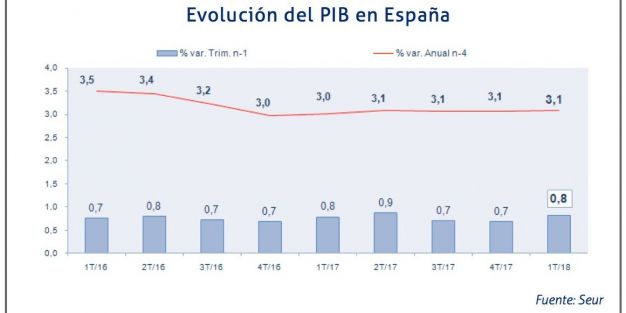 El Indicador de Actividad Económica de Seur, IAE, para el primer trimestre del año 2018 prevé un incremento del 0,8% del Producto Interior Bruto, PIB, lo que supone una aceleración respecto a trimestres anteriores y confirma además la tendencia de crecimiento de manera sostenida a un ritmo significativo.