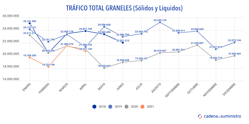Durante el pasado mes de abril, los puertos españoles han movido 13.426.069 toneladas de graneles líquidos, un 11,22% anual menos, así como 7.295.070 toneladas de graneles sólidos, un 21,59% más que hace un año.