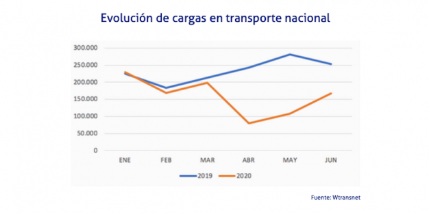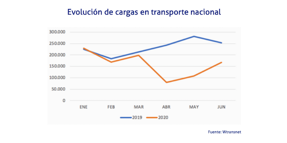 Por lo que respecta al transporte nacional, las ofertas de cargas con origen y destino España han caído un 32% con respecto al mismo semestre del año pasado, con los meses de marzo y abril en fuerte caída de hasta un 64% menos de cargas que en el mismo tramo de 2019.