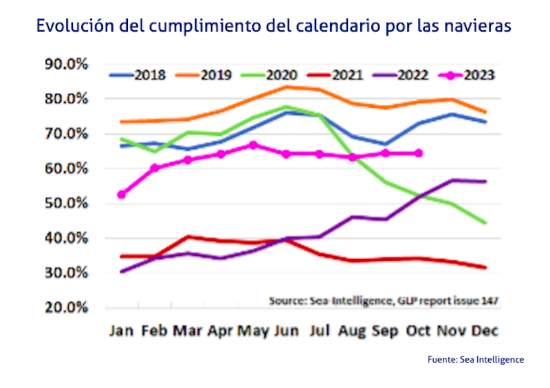 En este sentido, el último análisis de Sea Intelligence coloca su indicador de fiabilidad para el mes de octubre en un porcentaje de un 64,4%, sin variación con relación a septiembre de este mismo año, aunque, al tiempo, 12,6 puntos porcentuales por encima del registro del décimo mes de 2022.