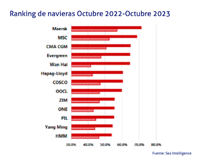 Por navieras, la más fiable es, según el análisis de Sea Intelligence, Maersk, con un porcentaje de fiabilidad de un 71,7%, seguida por MSC, con un 68,5%.
