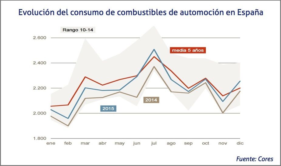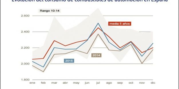 El consumo de combustibles de automoción en España ha aumentado un 3,4% en 2015 con respecto a 2014, totalizando 26.418 kt, tras el incremento del 4% en el consumo de gasóleo A, del que se han consumido 21.772 kt, y el aumento del 0,7% en las gasolinas, que ascienden a 4.646 kt.