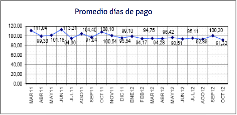 Desde marzo de 2011 en que se inició el estudio de las muestras que ha permitido poner en marcha el Observatorio, se ha ido manifestando una disminución en los referidos plazos de pago frente a los 111 días de media existentes en dicha fecha hasta los 91 días de promedio en octubre de 2012. Respecto al año anterior, el número de días ha descendido significativamente ya que el número de días de promedio de 2011 fue de 108 frente a los 91 de este ejercicio.