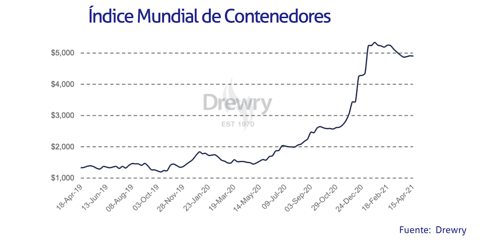 El Índice Mundial de Contenedores elaborado por Drewry, que evalúa las tasas de carga de contenedores en las ocho rutas principales hacia y desde Estados Unidos, Europa y Asia, se ha reducido apenas un 0,1% en la segunda semana de abril de 2021.