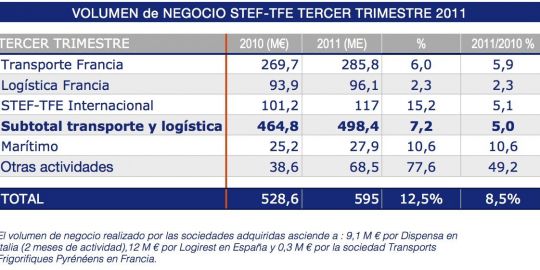 El grupo STEF-TFE ha realizado un volumen de negocio acumulado al final de septiembre de 1.672,4 millones de euros, lo que representa un incremento del 10,5 % con respecto al mismo período de 2010. En perímetro comparable, el incremento del volumen de negocio es del 8,9%.