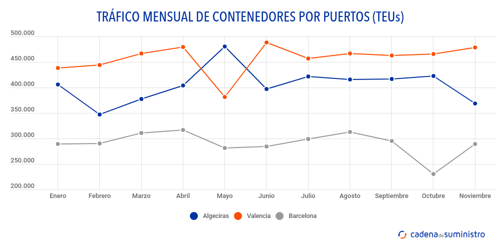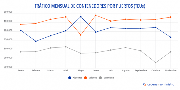 El puerto de Valencia ha manipulado 478.903 TEUs en noviembre de este mismo año, un 0,92% más que hace un año. De ese volumen total, 243.234 TEUs corresponden a tránsito, un 4,95% anual menos, y 235.669 TEUs a tráficos nacionales y exteriores, un 7,79% más que hace un año.