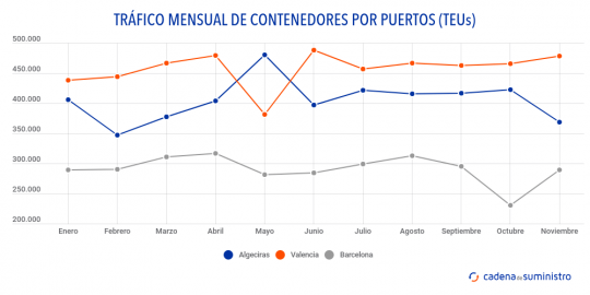 Por otra parte, por el puerto de Algeciras han pasado 368.716 TEUs en el mes, un 14,65% menos que hace un año. Con más detalle, su movimiento de contenedores en tránsito del enclave algecireño ha descendido un 17% anual, hasta colocarse en un total de 308.551 TEUs, mientras que su tráfico nacional y exterior ha retrocedido un 2,36% con respecto a noviembre del año pasado, para situarse en los 58.810 TEUs.