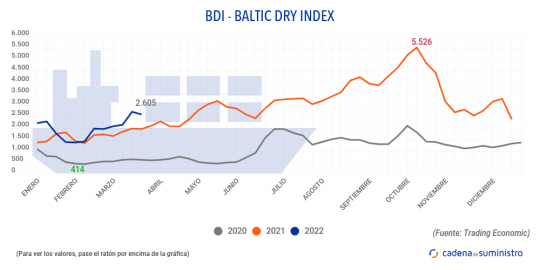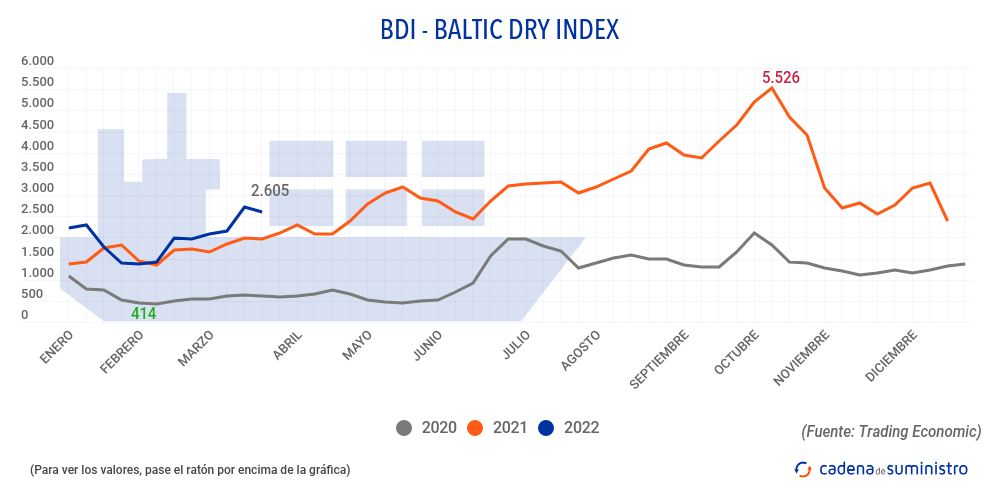 El Baltic Dry Index, BDI, que refleja los precios de los fletes de buques graneleros tomando como referencia 23 rutas marítimas, ha registrado el viernes 18 de marzo de 2022 un incremento de 17 puntos o un 0,7% hasta los 2.605. En lo que respecta a la última semana, sin embargo, se ha reducido en un 4,2%.