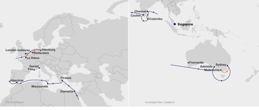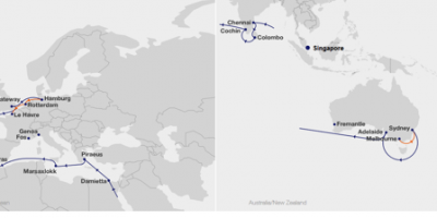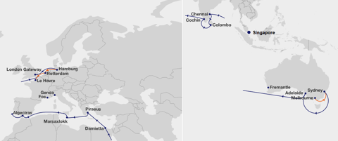 La rotación del nuevo servicio es: Fremantle - Melbourne – Sydney - Adelaida – Singapur – Chennai - Colombo – Cochin - Suez – Damietta – Pireo – Malta – Algeciras - Puerta de Londres – Rotterdam – Hamburgo - Le Havre – Fos-Sur-Mer – Génova – Damietta – Suez – Pointe de Gallets (Reunion) – Fremantle.