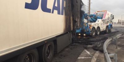 Un camión del Grupo J. Carrión ha sido incendiado tras ser asaltado por varios inmigrantes en la madrugada del viernes 29 de julio al sábado 30 en la circunvalación de Calais, cerca de la salida de Hoverport.