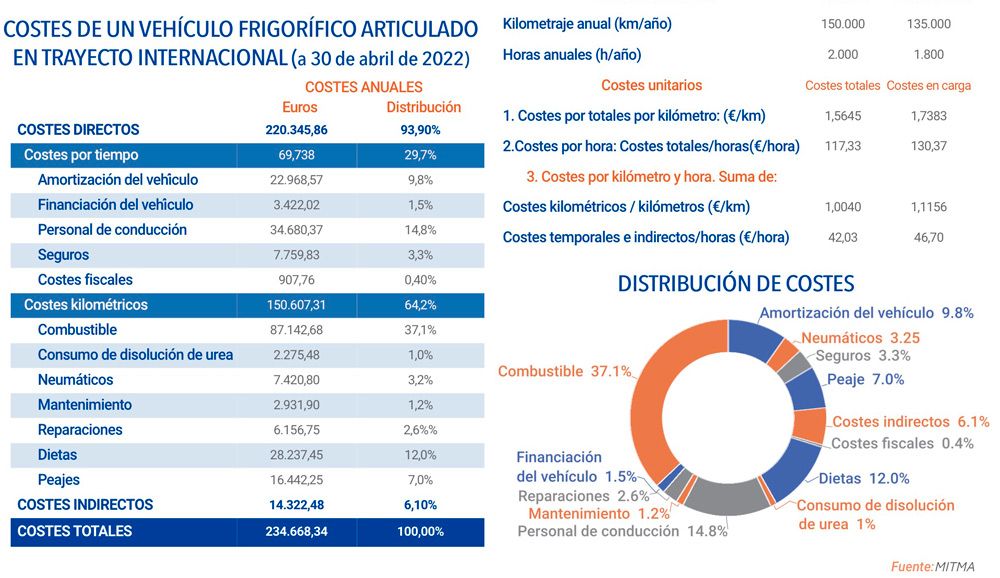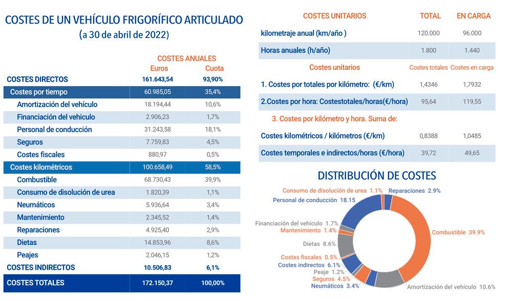 Teniendo en cuenta los datos estadísticos del Observatorio de Costes del Ministerio de Transportes, Movilidad y Agenda Urbana, los costes totales anuales de un vehículo frigorífico articulado se colocaban a fecha de 30 de abril de este mismo año en los 172.150,37 euros, un 13,27% más que hace un año y un 30,44% más que hace dos.