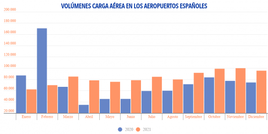 El tráfico total de carga aérea suma en todo 2021 un total de 998.470.938 kg, volumen que supone un incremento de un 26,5% con respecto a 2020, aún lejos por tanto de los datos prepandeima.x