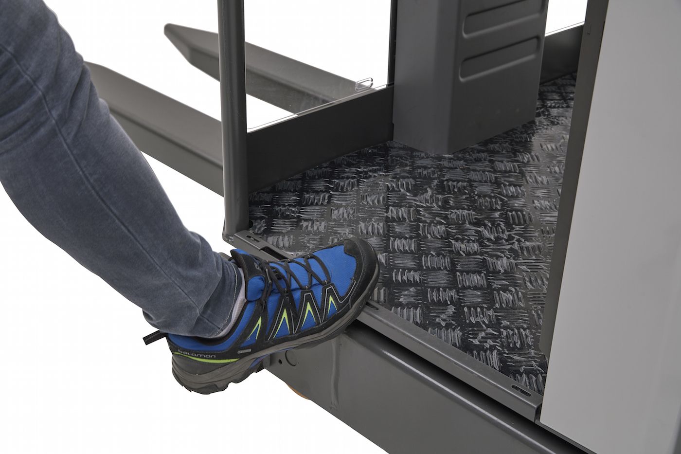En este caso, la base del recogepedidos está equipada con sensores en toda su superficie que reconocen por el peso si el conductor está presente y se activan independientemente de la dirección de la marcha, por lo que puede adoptar una postura cómoda y no tiene que estar presionando el interruptor de hombre muerto.