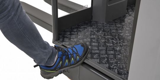 Por otro lado, la ergonomía que aporta este dispositivo se ve aumentada mediante la suspensión suave de la base de la recogepedidos, cuyo acabado plano y liso evita el peligro de tropiezos al moverse por la cabina.