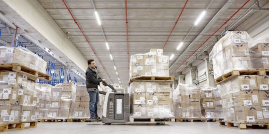 La distribución de mercancía hasta los muelles de carga se realiza normalmente con retráctiles UMS. Gracias a las numerosas ampliaciones del Centro, actualmente hay muelles de carga tanto en el lado norte como en el lado sur. Para los trayectos largos de transporte interno y la carga de camiones se utilizan las transpaletas modelos PLP y PMR.