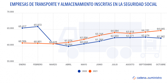 El número de empresas de transporte y almacenamiento inscritas en la Seguridad Social se mantiene al alza, de tal modo que, a finales del pasado octubre, el sector cuenta con 64.645 empresas, un 3,69% más que en el décimo mes del año pasado y un 0,71% más que en septiembre.