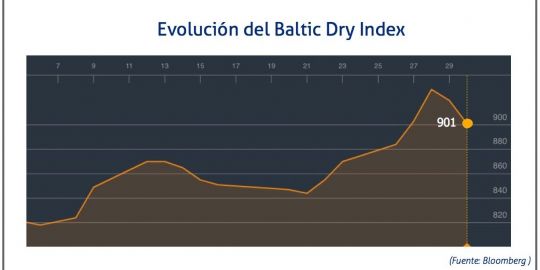El Baltic Dry Index, BDI, que refleja los precios de los fletes de los buques graneleros tomando como referencia 23 rutas marítimas, ha retrocedido el 30 de junio de 2017 hasta los 901 puntos, lo que supone un descenso de 19 puntos o del 2,07% respecto al registro anterior, un día antes.