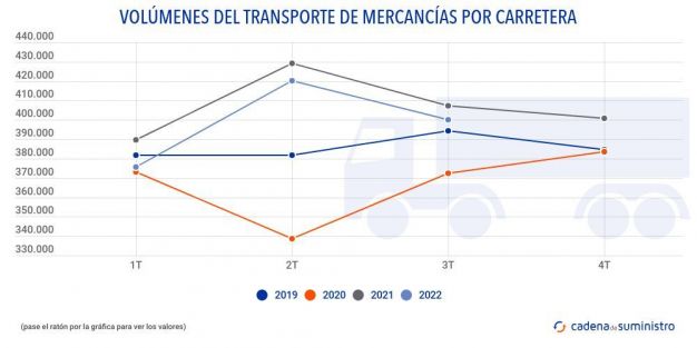Al mismo tiempo, el transporte internacional de mercancías suma 21.505.000 toneladas en el trimestre, un 8,42% más que en idéntico tramo de 2021.
