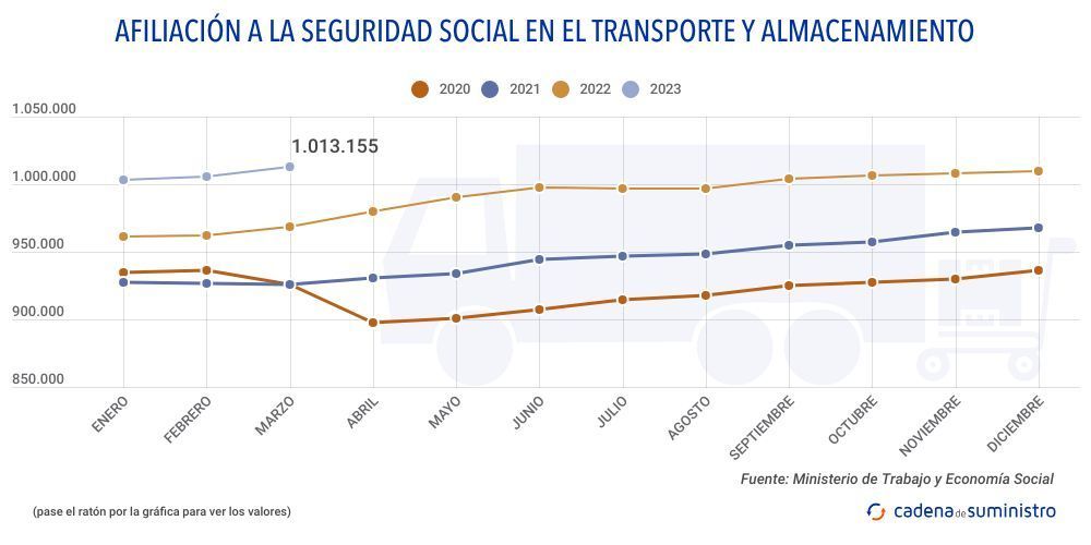 El volumen de afiliados a la Seguridad Social en el segmento de transporte y almacenamiento sigue la tendencia de febrero y ha vuelto a crecer en marzo.