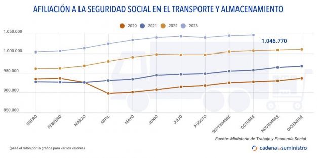 En línea con el ascenso de septiembre, el volumen de afiliados a la Seguridad Social en el segmento de transporte y almacenamiento ha vuelto a incrementarse en octubre.