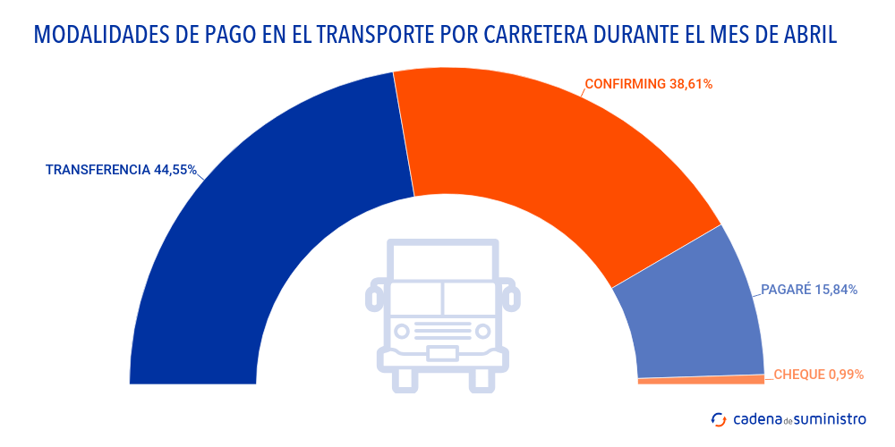 Los resultados del sexto mes de 2021 apuntan a que los medios de pago preferidos por los clientes de los transportistas son la transferencia, con un 45%, seguido por el confirming, con otro 39%, el pagaré, con un 16%, y el cheque, con menos de un 1%.