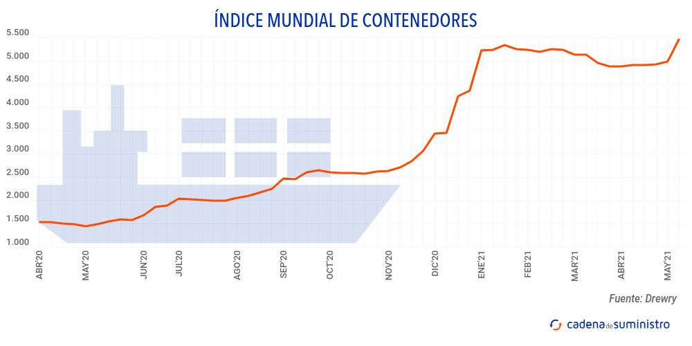El Índice Mundial de Contenedores elaborado por Drewry, que evalúa las tasas de carga de contenedores en las ocho rutas principales hacia y desde Estados Unidos, Europa y Asia, se ha incrementado un 9,8% en la primera semana de mayo de 2021.