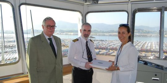 Como es habitual en la primera escala de un buque en un puerto, la directora del puerto de Santander, Cristina López Arias, ha hecho entrega al capitán de la metopa conmemorativa de su primera escala en el puerto cántabro.