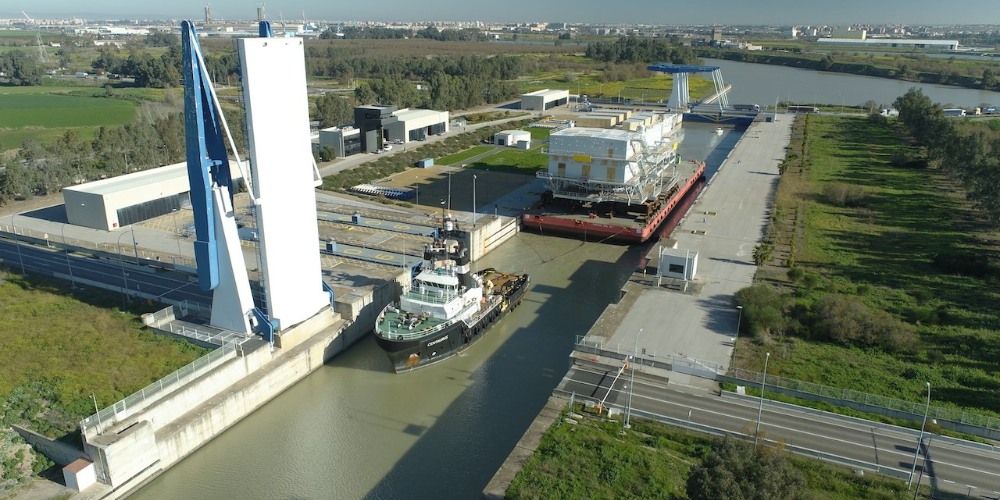 El muelle de Armamento del puerto de Sevilla se ha convertido en el punto desde el que ha zarpado de la megaestructura de una subestación eléctrica, cuyo destino es un parque eólico marino en la costa de Virginia, en los Estados Unidos.