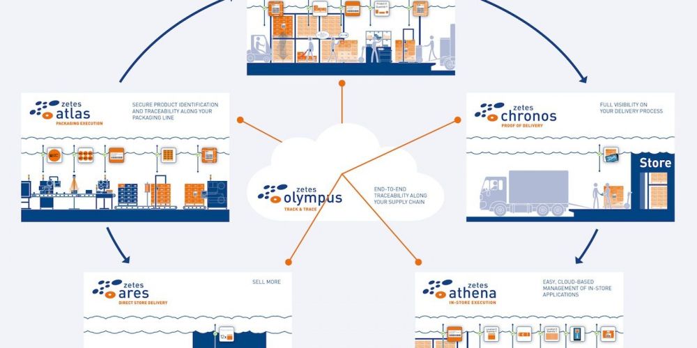 La suite principal, ZetesOlympus, actúa como un repositorio central de datos para poder conectar con distintas fuentes de información y poner los datos a disposición de varias empresas implicadas en el proceso. Consta de las soluciones ZetesAtlas, ZetesMedea, ZetesAres, ZetesChronos y ZetesAthena, cada una de las cuales aborda las necesidades específicas de un eslabón de la cadena de suministro, desde la línea de producción a la tienda.