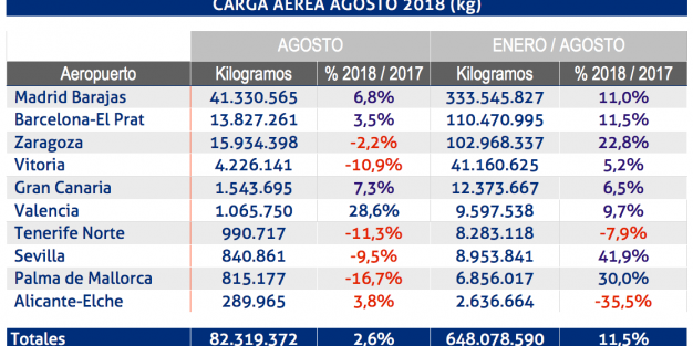 Entre enero y agosto, la carga aérea de los aeropuertos españoles suma un volumen total de 648.078.590 kg, un 11,5% más que en el mismo periodo de 2017. Por lo que respecta a las operaciones, en toda la red de Aena se han registrado 231.499 en agosto, un 4,4% más que hace un año, con un total de 1.542.014 en estos ocho meses, que marcan un crecimiento del 5,6%.