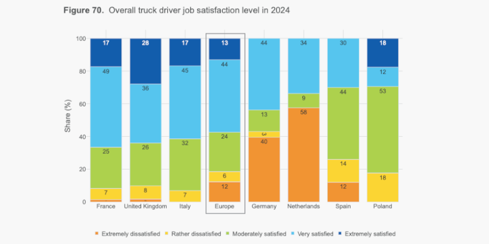 Sin embargo, en paralelo, el estudio asevera que los chóferes están satisfechos con su empleo. En el caso español, un 44% de todos ellos asegura estar moderadamente satisfecho y otro 30% está muy satisfecho, mientras que otro 14% está poco satisfecho y el 12% restante no está nada satisfecho. La situación en el país es peor que la del resto del continente, donde un 57% de los chóferes está muy o extremadamente satisfecho con sus condiciones laborales.