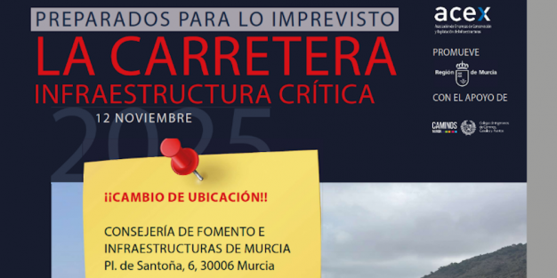 La jornada “Preparados para lo imprevisto. La carretera, infraestructura crítica”, promovida por Gobierno de la Región de Murcia y organizada por la Asociación de Empresas de Conservación y Explotación de Infraestructuras, cuenta con el apoyo del Colegio de Ingenieros de Caminos, Canales y Puertos de Murcia, y tendrá lugar en la sede de la Consejería de Fomento e Infraestructuras de Murcia.