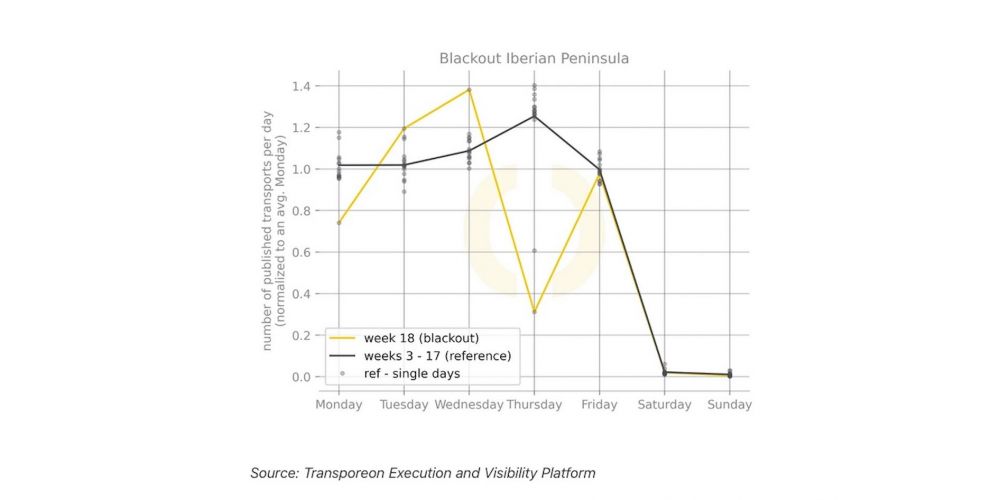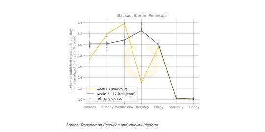 En paralelo, Transporeon también destaca los efectos del gran apagón ibérico en otro indicador de actividad del transporte de mercancías por carretera como es la productividad medida en kilómetros realizados.
