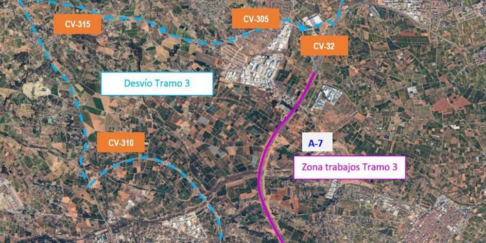 Así mismo, para asegurar la fluidez del tráfico durante dicha afectación, se habilitará un itinerario alternativo debidamente señalizado por las carreteras CV-32, CV-305, CV-315 y CV-310 en dirección Náquera y Bétera hasta volver a enlazar con la A-7 en el kilómetro 321,5.