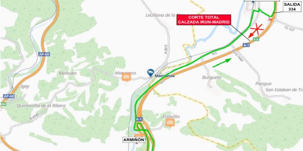Con motivo de estos trabajos, y para garantizar la seguridad de los trabajadores y usuarios, se producirá el corte total al tráfico en el sentido Irún-Madrid por la A-1, entre la salida 334, correspondiente al enlace de La Puebla de Arganzón, en Burgos y la salida 328 que da al enlace de Armiñon, en Álava, desde las diez y media de la noche del lunes 14 hasta las cinco y media de la madrugada del martes 15 de abril.