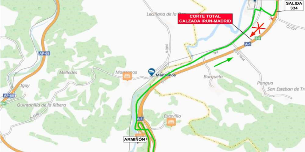 Para garantizar la seguridad de trabajadores y usuarios, se producirá el corte total al tráfico en el sentido Irún-Madrid por la A-1, entre la salida 334 y la salida 328, desde las 22:30 horas de mañana martes 25 hasta las 5:30 horas del miércoles 26 de marzo.