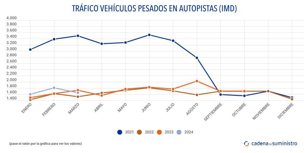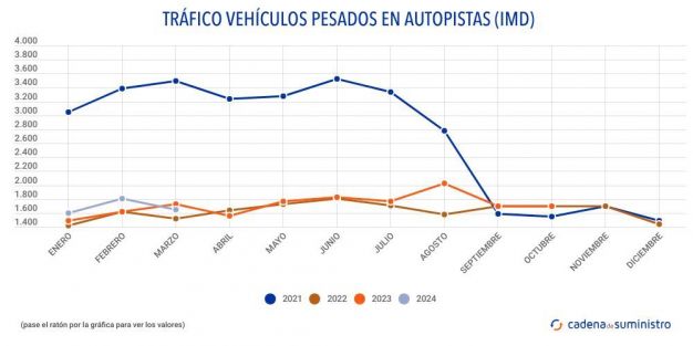 Dicha cifra indica que el tráfico pesado de las autopistas de peaje del país constituye el 11,64% del total de vehículos que han utilizado estas vías a diario durante el período, que, según los últimos datos reportados por el Ministerio de Transportes y Movilidad Sostenible, suma un total de 14.200 vehículos al día de media, cifra que, a su vez, implica un ascenso anual de un 7,58%.